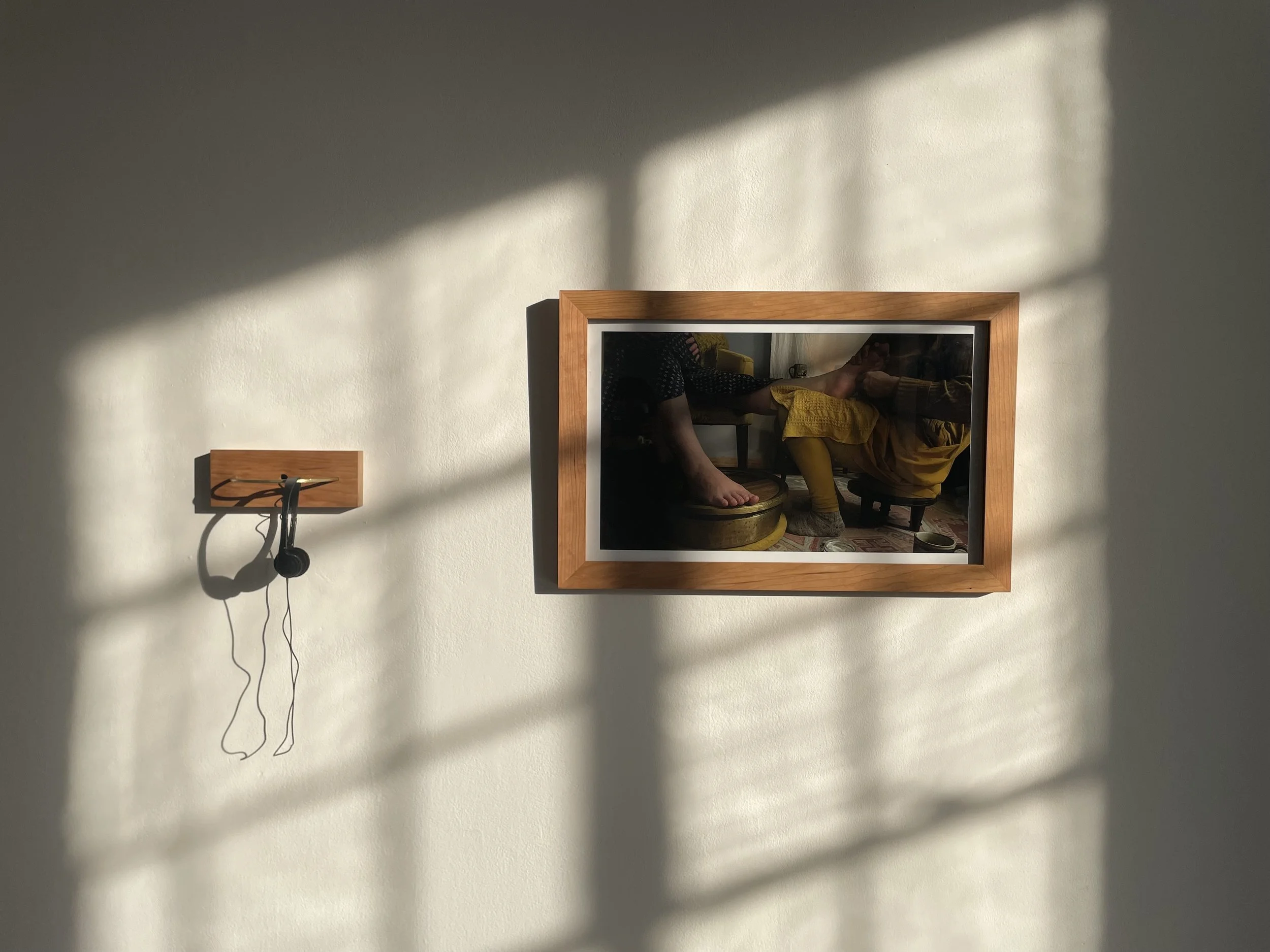 Handmade tools for platonic intimate touch, reupholstered chair, handmade stool, brass and walnut foot bath, rejuvenation ritual with community members in need of extra support.